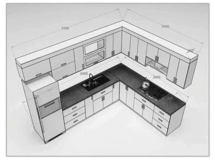 Подходит для угловых кухонь. Гарнитур располагается вдоль двух смежных стен, что позволяет разделить пространство на две зоны: в одной можно разместить холодильник и шкафы для хранения, в другой — рабочую зону с мойкой и плитой. Такая планировка эффективно использует углы и подходит для помещений разной площади.