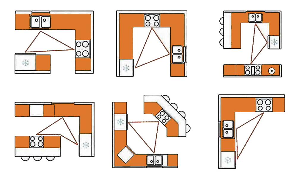 Это базовая схема, где три ключевых элемента — холодильник, мойка и плита — образуют треугольник. Такое расположение обеспечивает удобство при готовке: сначала достают продукты из холодильника, затем моют их и готовят на плите. Оптимальное расстояние между этими точками — от 120 до 270 см.